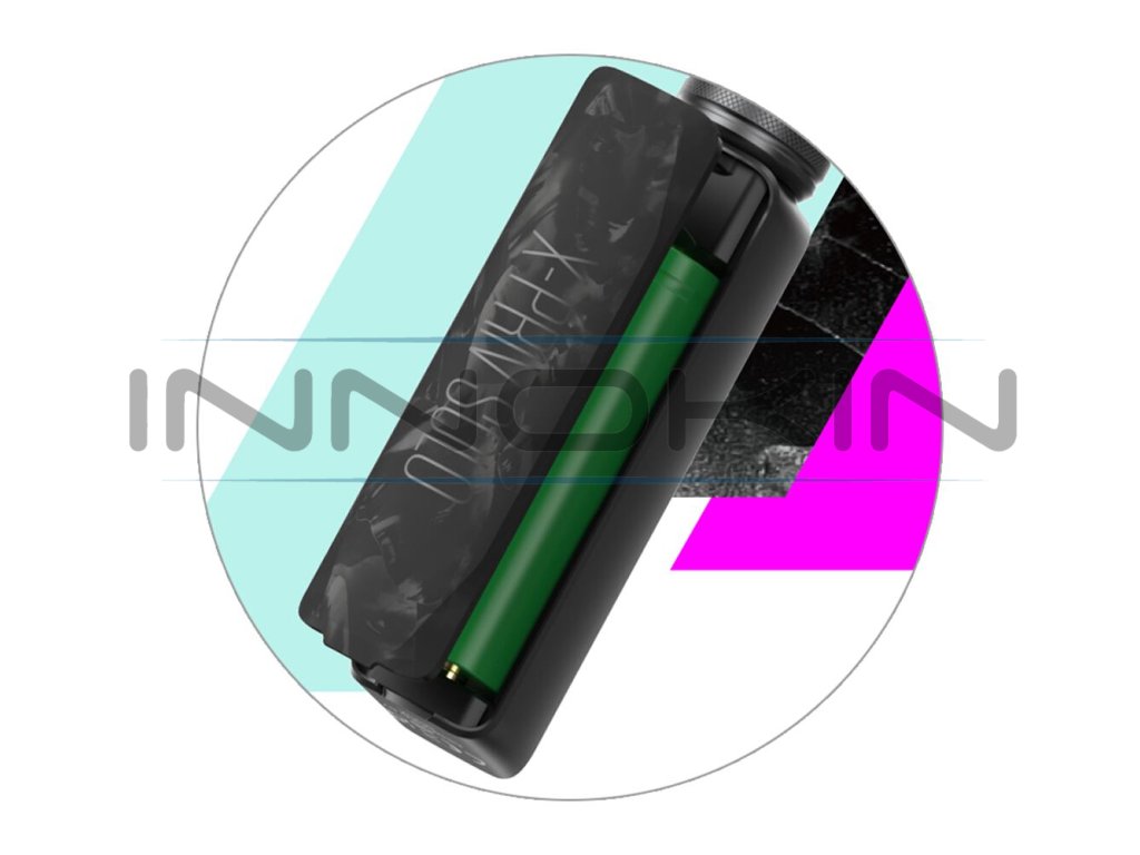 Boční panel se silnými magnetickými úchyty ukrývá slot pro vložení vlastní baterie. Mod pracuje s bateriemi typu 18650. Do těla si tak snadno zvolíte svou oblíbenou baterii tohoto typu dle vašich potřeb a můžete se těšit na obrovský výkon a hladký náběh žhavení s téměř instantní odezvou. Baterii si můžete také pohodlně dobíjet přímo ve vašem modu díky portu USB-C s podporou rychlého nabíjení.
