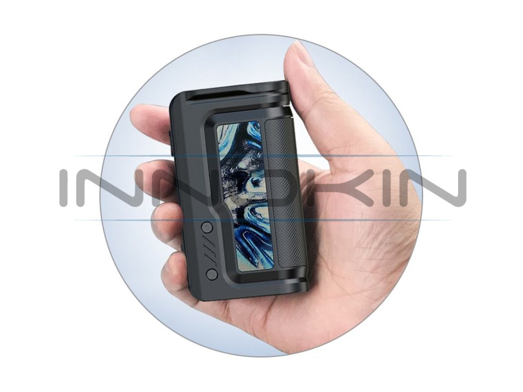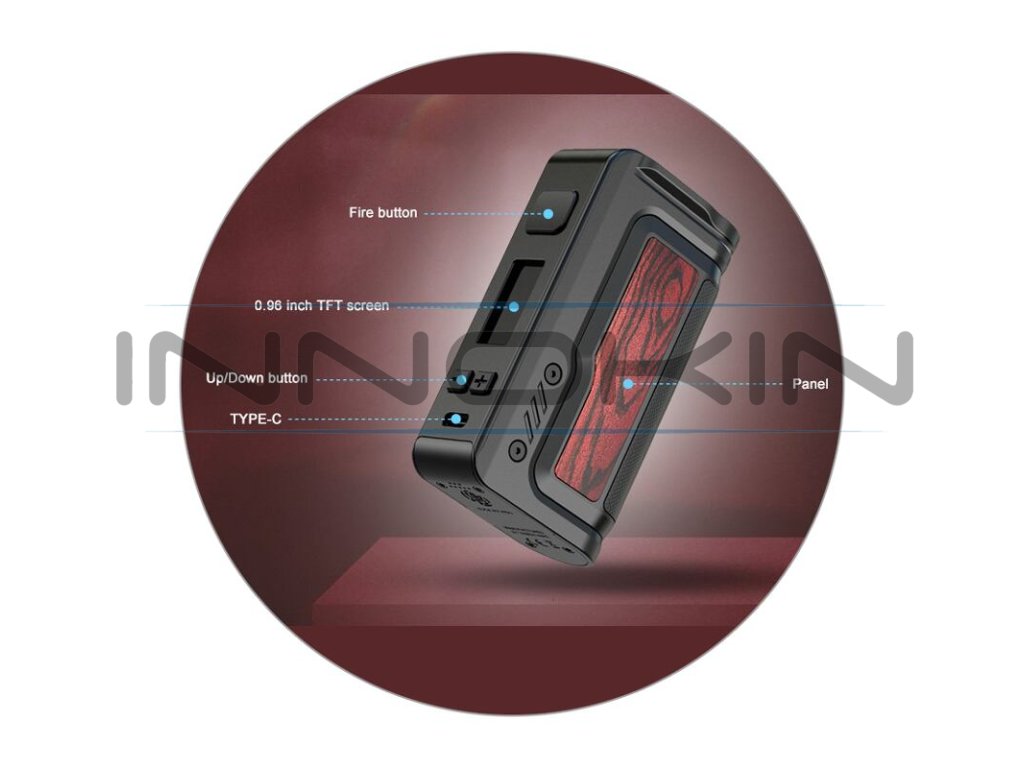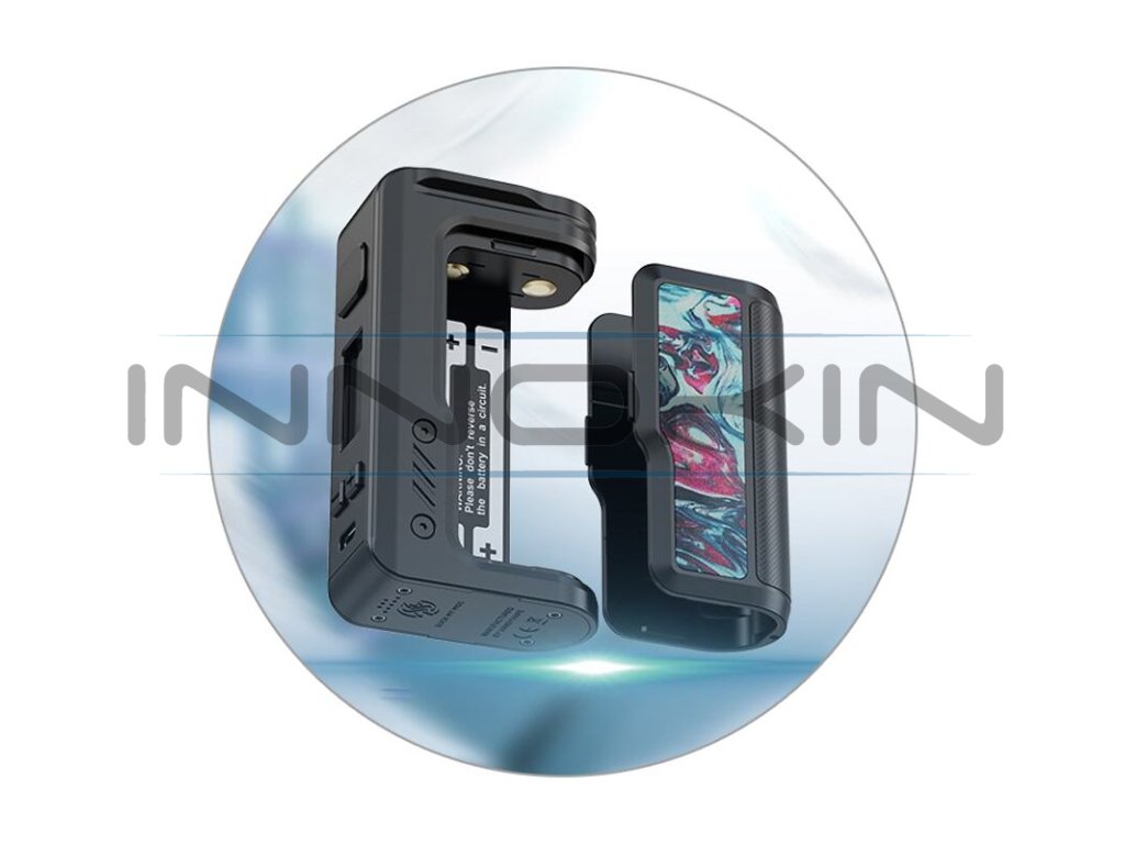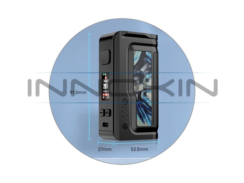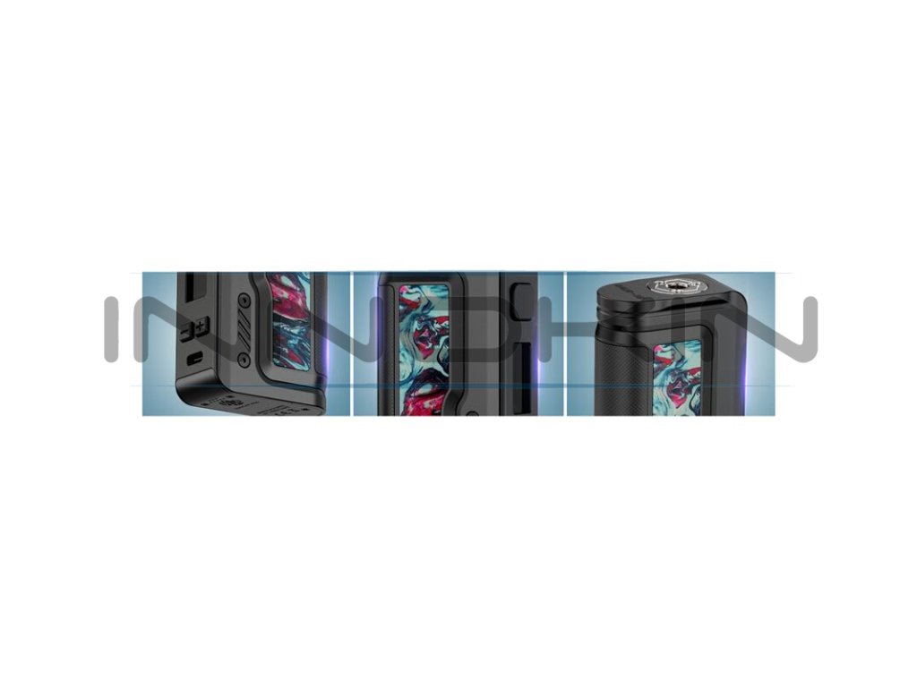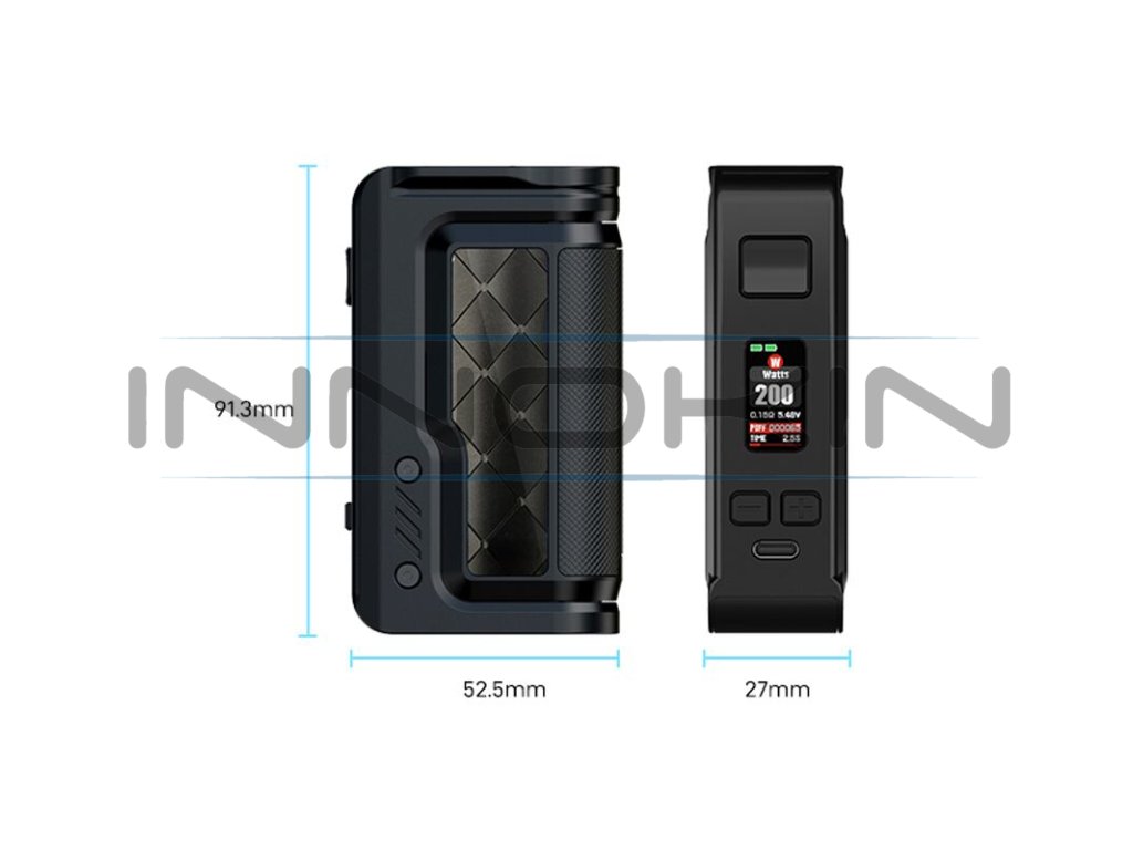 Mod pracuje se dvěma bateriemi typu 18650, které se do těla vkládají po vysunutí zadního panelu. Díky pohonu na dvě baterie se můžete těšit na nekompromisní výstupní výkon, který dosahuje až 200 W. Samozřejmostí je podpora dobíjení obou baterií přímo v modu díky portu USB-C, který se nachází na předním panelu. Lze dobíjet proudem až 1,8 A.