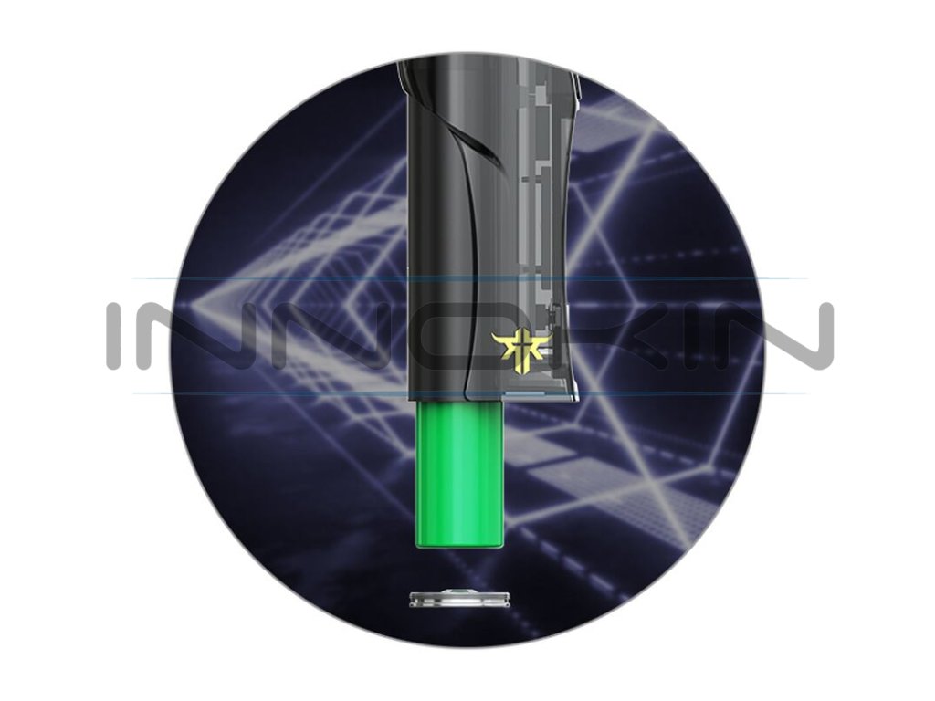 Ve spodní části modu se nachází uzávěr pro slot baterie, mod pracuje s jednou baterií typu 21700, lze však používat také standardní baterie 18650 díky přiloženému adaptéru. Díky pohonu na baterii 21700 můžete mod osadit vysokokapacitním článkem pro potřeby DL, nebo MTL potahu a pro dlouhou výdrž celého modu. Baterii budete moci pohodlně dobíjet přímo v modu díky rozhraní USB-C.