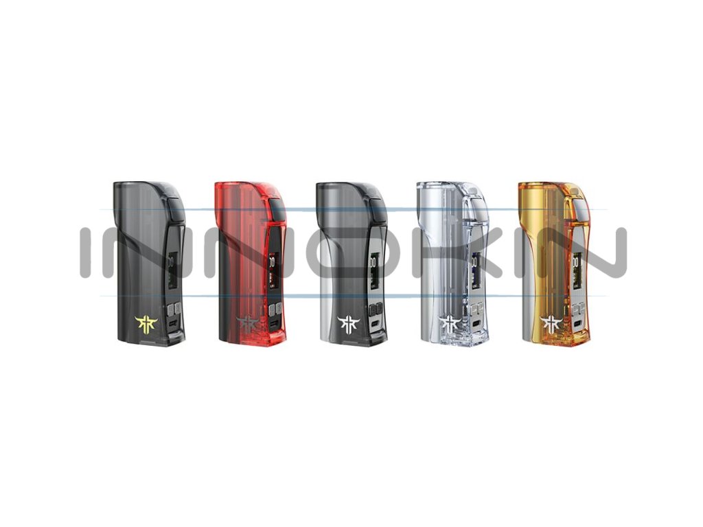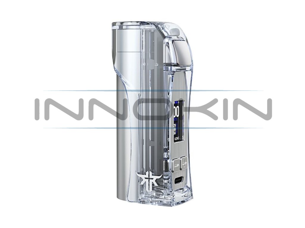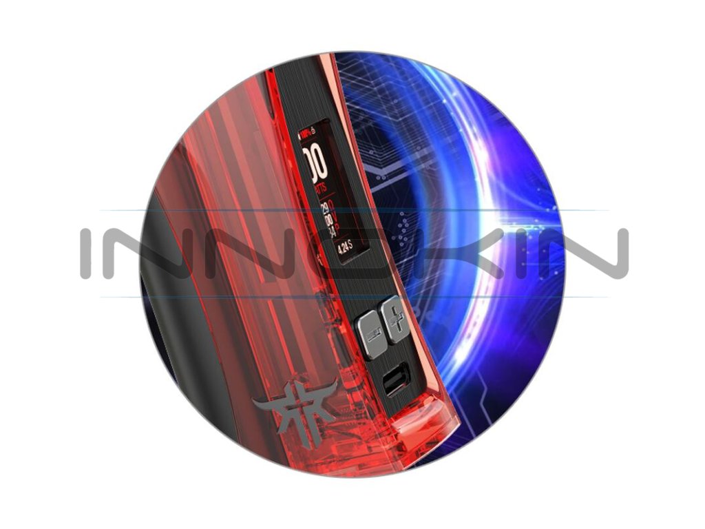 Ve spodní části modu se nachází uzávěr pro slot baterie, mod pracuje s jednou baterií typu 21700, lze však používat také standardní baterie 18650 díky přiloženému adaptéru. Díky pohonu na baterii 21700 můžete mod osadit vysokokapacitním článkem pro potřeby DL, nebo MTL potahu a pro dlouhou výdrž celého modu. Baterii budete moci pohodlně dobíjet přímo v modu díky rozhraní USB-C.