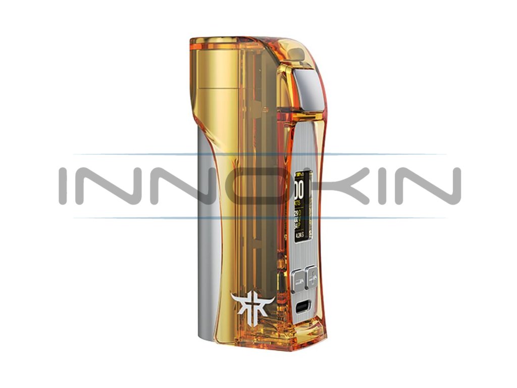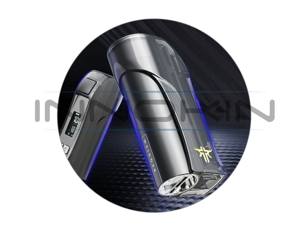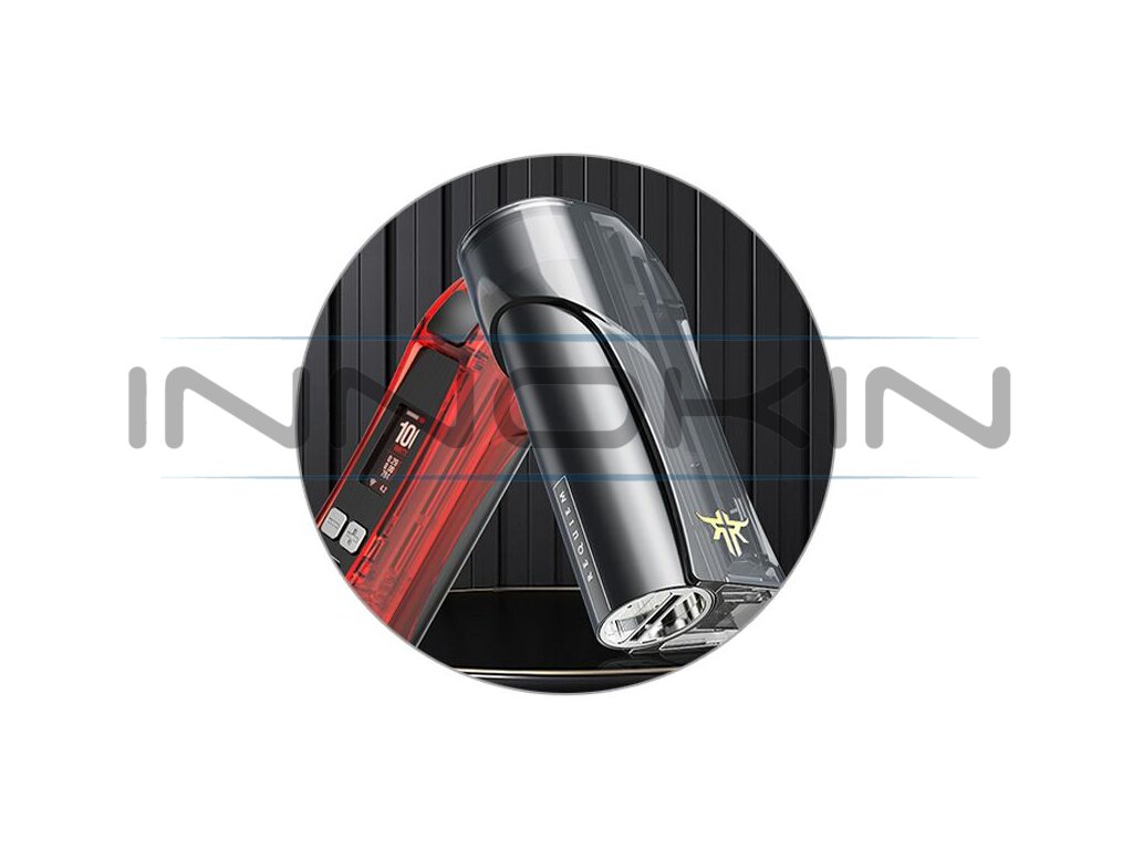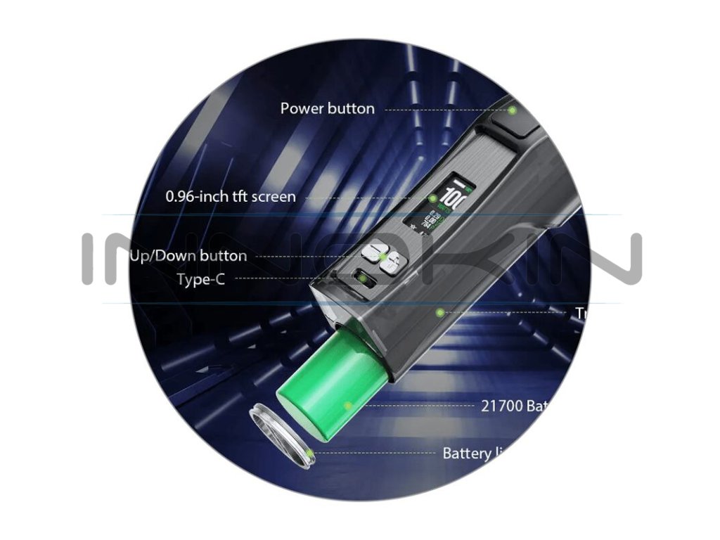 Ve spodní části modu se nachází uzávěr pro slot baterie, mod pracuje s jednou baterií typu 21700, lze však používat také standardní baterie 18650 díky přiloženému adaptéru. Díky pohonu na baterii 21700 můžete mod osadit vysokokapacitním článkem pro potřeby DL, nebo MTL potahu a pro dlouhou výdrž celého modu. Baterii budete moci pohodlně dobíjet přímo v modu díky rozhraní USB-C.