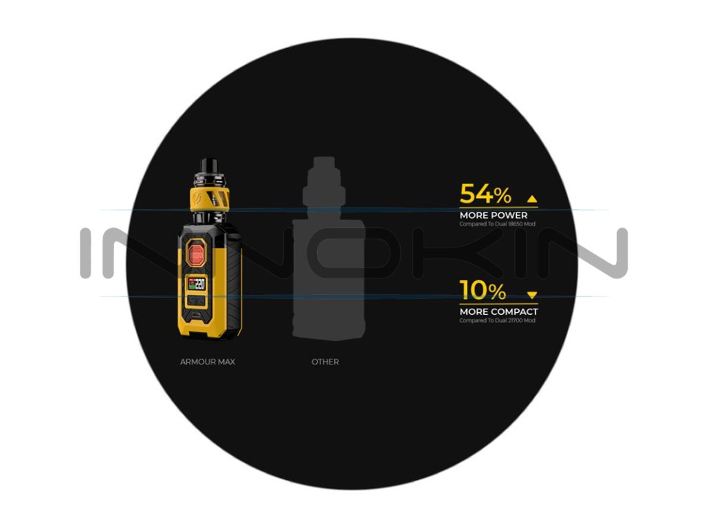 Světoznámý výrobce Vaporesso se tentokrát zaměřil na milovníky velkých gripů a outdoorové odolné estetiky. Přináší tak hned dva modely s názvy Vaporesso Armour Max a Armour S. Grip Vaporesso Armour Max je skutečně robustní zařízení, jehož hlavní předností je zejména netradičně zpracovaná konstrukce a prvotřídní elektronika v těle, která umožňuje používání gripu s celou řadou výstupních režimů. Robustní konstrukce zařízení je vyrobena z mimořádně odolného TPU materiálu, který zesiluje celkovou odolnost modu a posouvá ji daleko nad běžné kovové a plastové gripy. Spodní část modu ukrývá slot pro dvě baterie typu 21700, případně 18650 s použitím redukce v balení. Díky pohonu na dvě baterie si mod dokáže poradit s ohromujícím výkonem až 220W. Baterie si budete moci pohodlně dobíjet přímo v modu prostřednictvím portu USB-C s podporou 2A nabíjení.