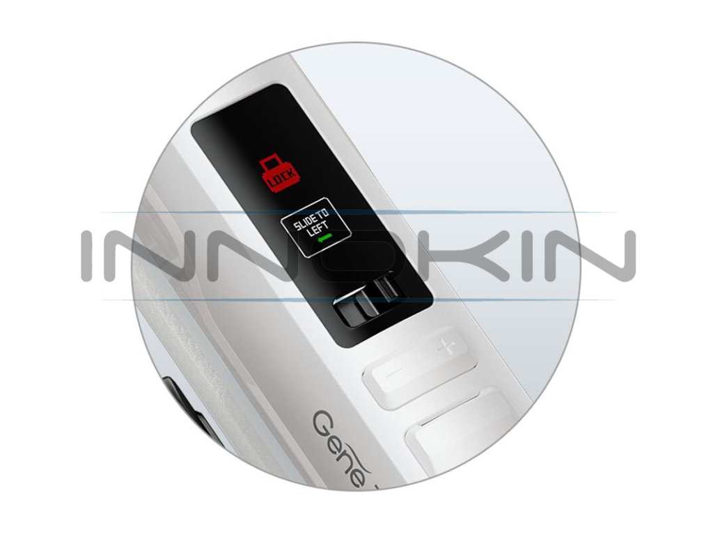 Přímo u displeje se nachází praktické zamykací tlačítko. Jeho posouváním tak můžete mod uzamykat, či odemykat. Manuální zámek využijete například při častém přenášení modu v kapse, nebo v cestovním zavazadle, zabraňuje nechtěnému a samovolnému sepnutí zařízení, slouží však také jako praktická dětská pojistka.
