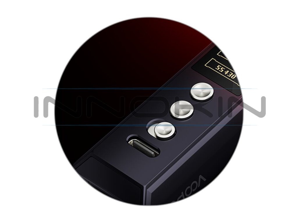 V těle modu najdete slot pro vložení jedné externí baterie. Mod pracuje s bateriemi typu 21700, případně s klasickými bateriemi 18650 po použití adaptéru. Díky slotu pro externí baterii nabídne mod svobodu při výběru vlastního specifického článku pro co nejlepší výsledky při vapování. Samozřejmostí je potom také podpora rychlého nabíjení baterie přímo uvnitř modu, stačí jen připojit USB-C kabel a začít dobíjet proudem až 2.5 A.