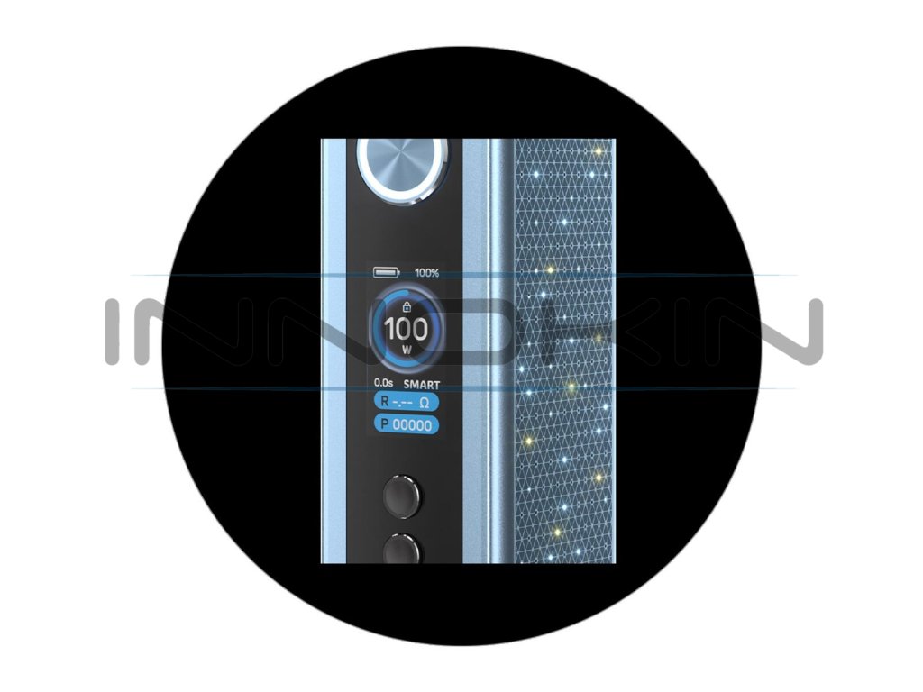 Tělo modu ukrývá slot pro vlastní externí baterii typu 18650. Po vložení vlastní baterie můžete začít naplno využívat všechny funkce modu. Největší předností je potom podpora obrovského výstupního výkonu až 100W s plnohodnotnou možností regulace, velice snadno a rychle si tak upravíte výkon podle potřeby a můžete si vychutnávat svůj oblíbený styl potahu.