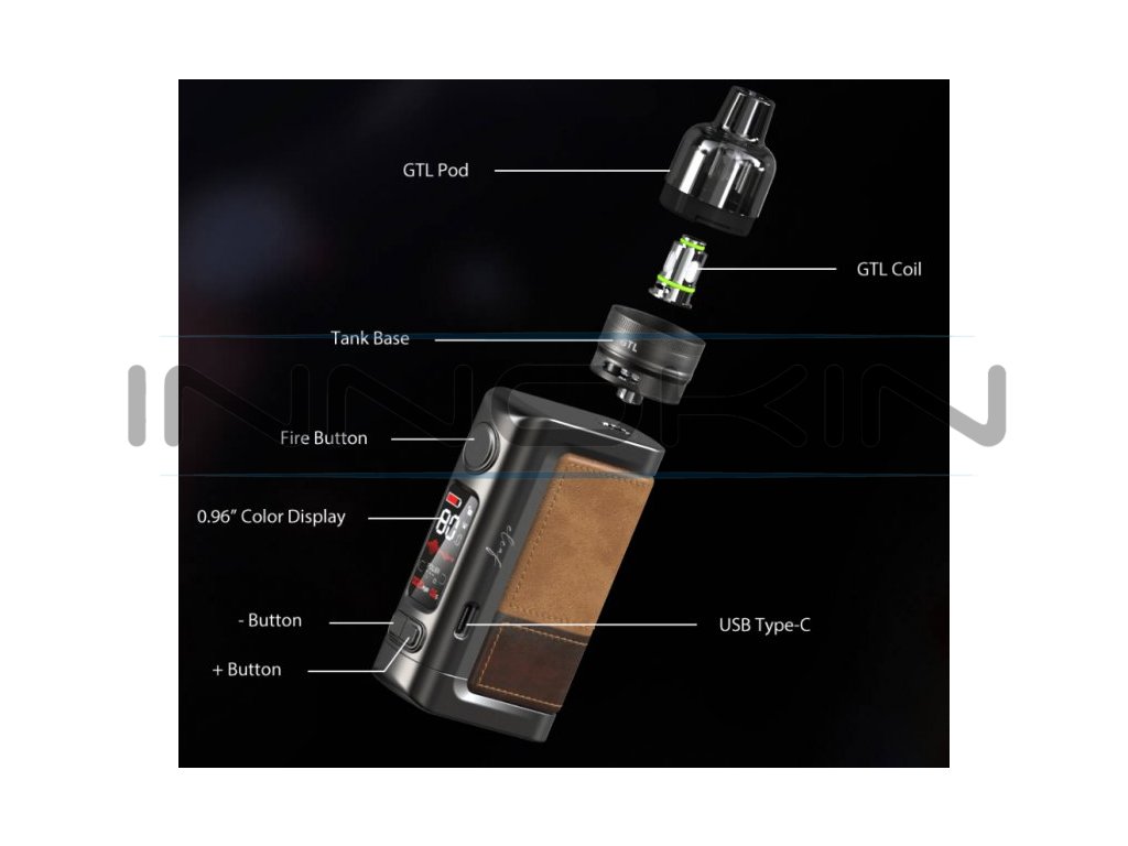 Není určeno pro náplně obsahující nikotin! Eleaf iStick Power 2 je doslova pořádným gripem, a to díky masivní konstrukci těla potažené kůží a vestavěnou baterií o kapacitě 5000mAh s rychlým 2A nabíjením pomocí USB-C portu. Inteligentní čip INSIDE kromě běžného režimu POWER podporuje režimy SMART a VOLTAGE, které mají funkci inteligentního doporučení optimálního výkonu/napětí pro různé odpory žhavících hlav. Barevný TFT 0,96palcový displej nabízí detailní informace o nastavení. Mezi jeho další přednosti patří ochrana proti zkratu, přehřátí, přežhavení, nízkému odporu a 10-ti vteřinová ochrana žhavení. Clearomizer GTL Pod pojme až 4,5ml liquidu. V základním balení budete mít na výběr dvě žhavící hlavy, a to GTL o odporu 0,4ohm a 0,8ohm. Regulace přívodu vzduchu pro nastavení optimální kouřivosti se nachází ve spodní části.
