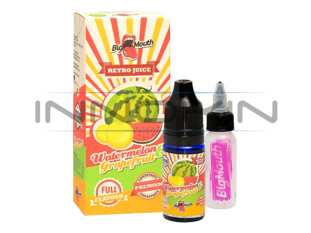 Osvěžující kombinace vodního melounu a grepu... Příchutě Big Mouth jsou jedny z nejlepších příchutí pro tvorbu vlastních liquidů. Součástí designového balení je 10ml lahvička s příchutí a 30ml lahvička pro namíchání liquidu. Výroba probíhá za nejpřísnějších hygienických standardů ve farmaceutické laboratoři. Jedná se o koncentrát, který se kape do báze. Příchuť může být použita pouze jako aroma do bází....nejedná se o hotový liquid.