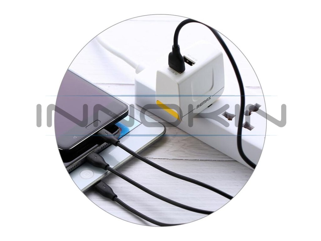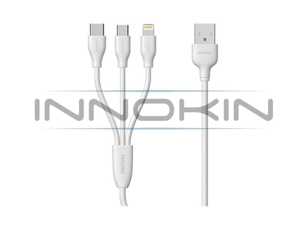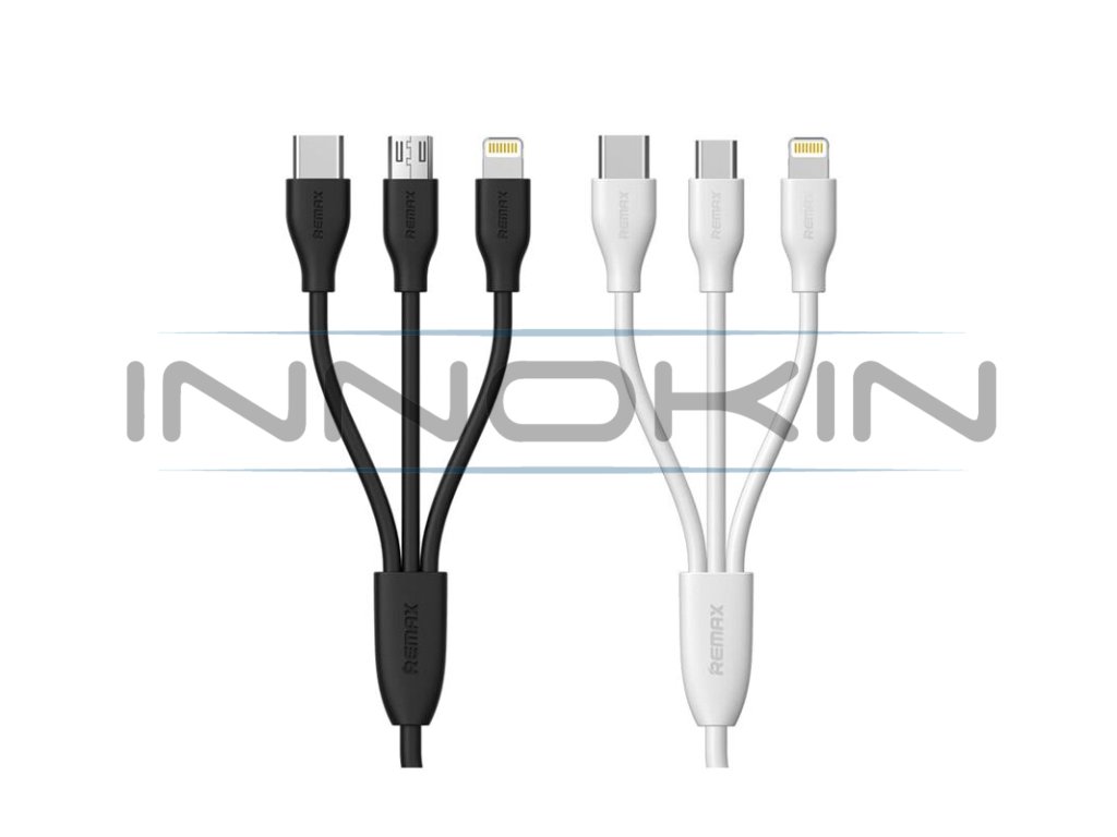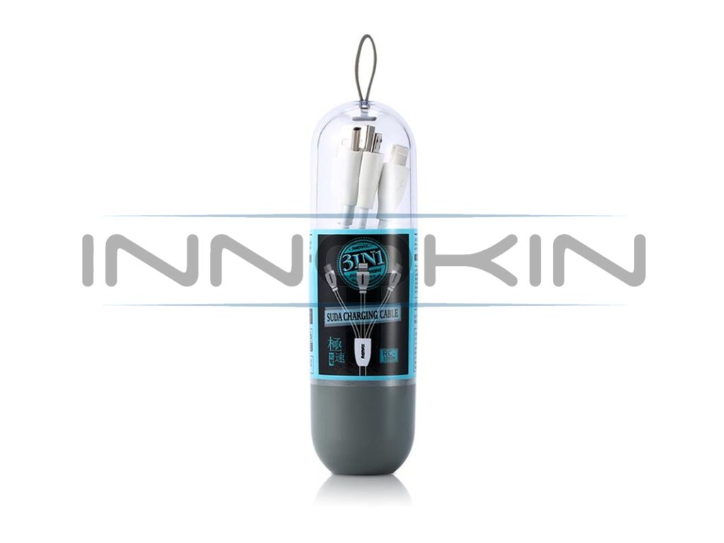 Univerzální a multifunkční dobíjecí kabel 3v1 REMAX SUDA slouží pro všechna zařízení disponující micro USB slotem, USB-C slotem, nebo Lightning slotem pro dobíjení. Samotný kabel disponuje třemi koncovkami, které slouží pro dobíjení různých zařízení. Hlavní výhodou tohoto kabelu je možnost dobíjení až třech zařízení současně. Můžete si tak pohodlně dobíjet elektronickou cigaretu, mobilní telefon a případně například tablet, nebo jakékoliv jiné zařízení. Na kabelu najete koncovky micro USB, USB-C a Lightning (pro zařízení Apple).