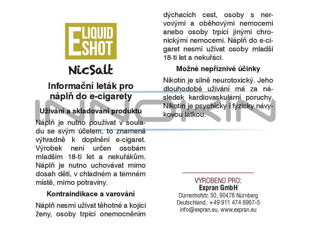 Nikotinový booster, určený pro míchání a výrobu vlastních e-liquidů. Poměr PG/VG 50/50. Obsah nikotinu 20mg/1ml. Celkový objem 10ml. Vyrobeno v...