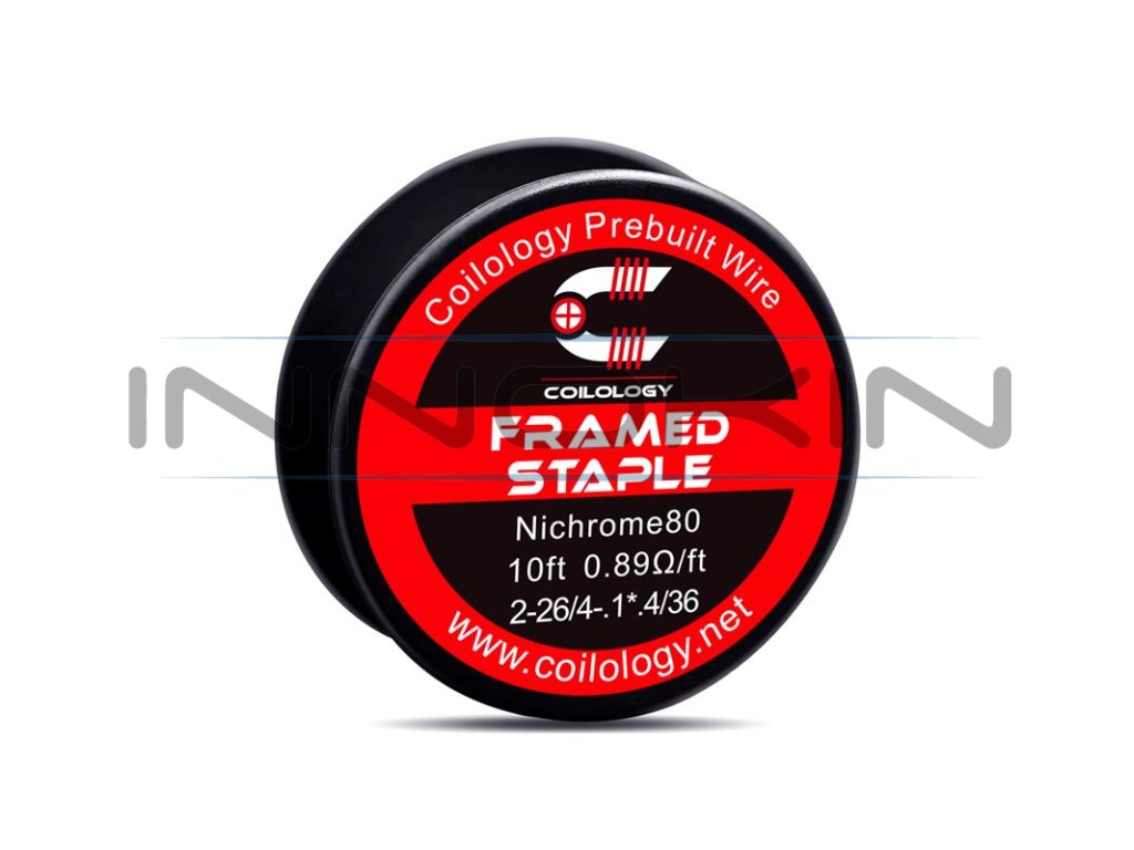 Coilology Framed Staple Ni80 je vysoce kvalitní odporový drát renomovaného výrobce Coilology. Drát je vhodný pro výrobu spirálek určených k vapingu a pro DIY atomizéry. Drát je vyrobený z nichromu, přičemž jeho jádro je tvořeno dvěma odporovými dráty (2-26GA; 2* 0,4 mm) a čtyřmi plochými odporovými dráty v jádru s rozměry 0,1 * 0,4 mm, celé jádro je potom omotáno tenkým nichromovým drátem s průměrem 0,13 mm (36GA). Drát je určený pro používání v režimu výkonu. Nelze ho použít pro teplotní režimy. Drát typu Framed Staple je vhodný pro cloudchasing a nízkoodporový vaping a pro