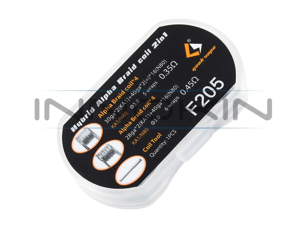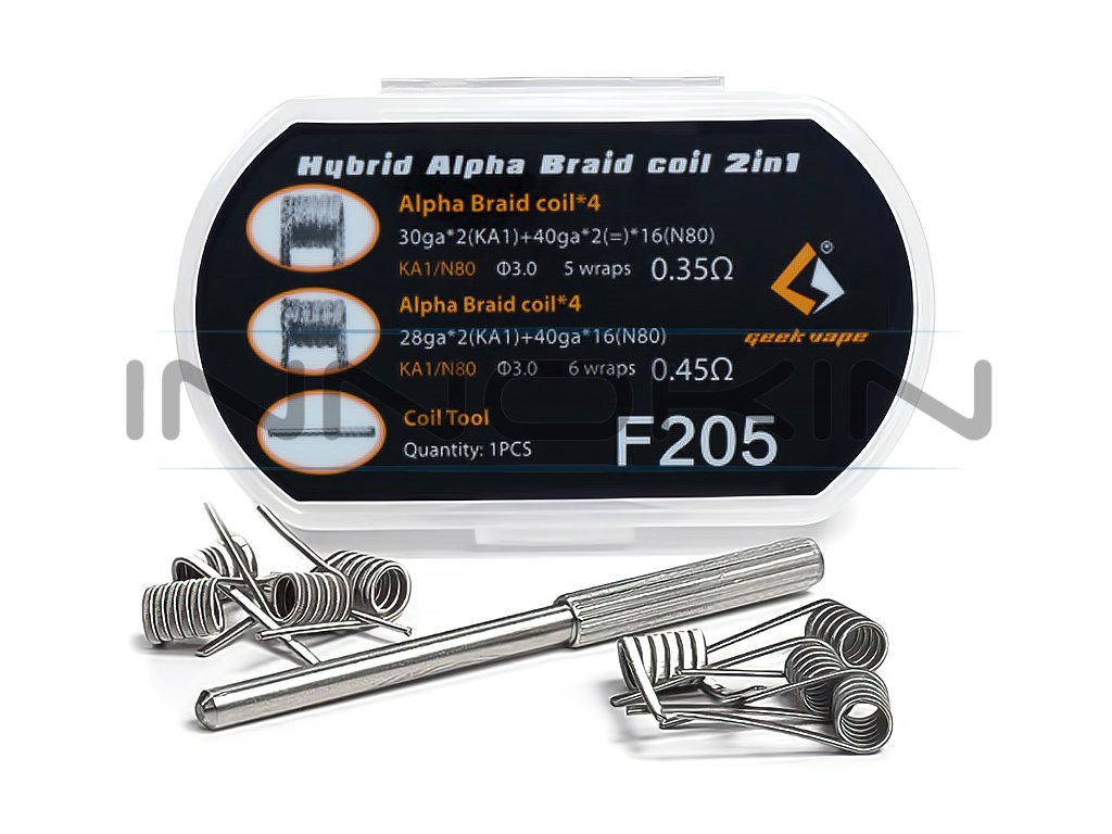 Již hotové, předmotané kanthalové spirálky od výrobce GeekVape, nesoucí označení Hybrid Alpha Braid. V tomto případě jde o unikátně spletené spirálky, které v sobě ukrývají jak kanthalový, tak nichromový odporový drát. V balení naleznete také speciální nástroj se dvěma různými průměry, takže si můžete spirálky jednoduše uzpůsobit.