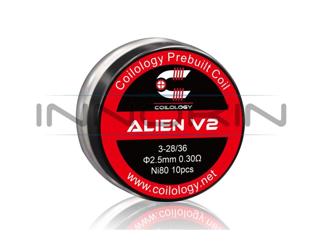 Předmotané spirálky Coilology Alien V2 Ni80 disponují odporem 0,3 ohm. Jsou vyrobeny z nichromu. Jsou tvořeny třemi opdporovými dráty s průměrem 0,3 mm (28GA), které jsou omotané tenkým nichromovým drátem s průměrem 0,13 mm (36GA). Jsou určené pro