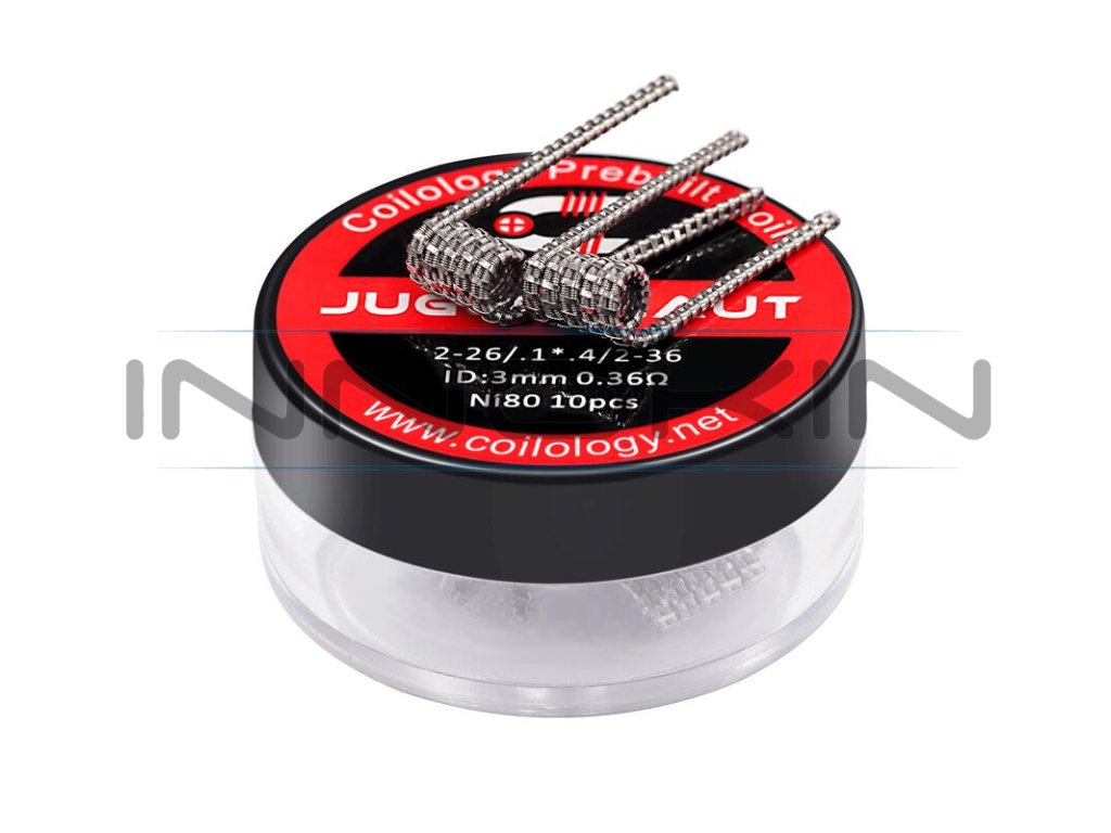 Předmotané spirálky Coilology Juggernaut Ni80 disponují odporem 0,36 ohm. Jsou vyrobeny z nichromu. Spirálky Juggernaut tvoří dva dráty s jádrem 2* 0,4 mm (2* 26GA), tyto dráty jsou omotány dvěma tenkými dráty v konfiguraci 2* 0,13 mm (2* 36GA). Oba tyto clapton dráty jsou k sobě následně připojené a stažené prostřednictvím pevného plochého drátu s rozměry 0,1 * 0,4 mm. Tyto složitější spirálky jsou ideální volbou pro cloudchasing,