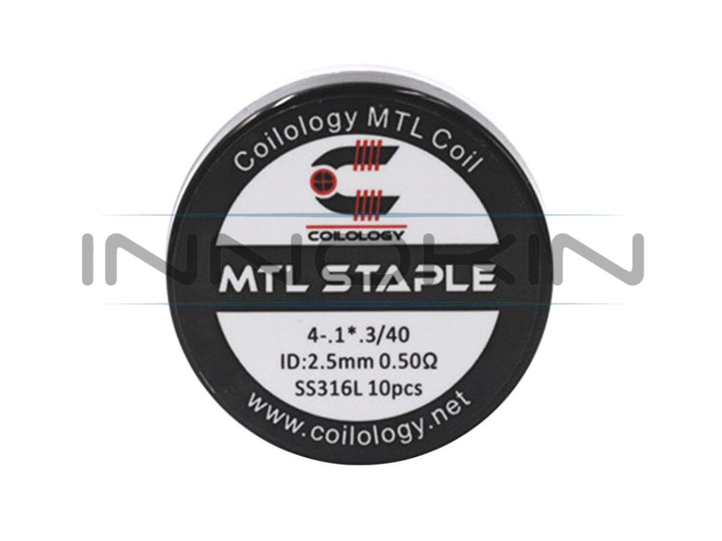 Předmotané spirálky Coilology MTL Staple SS316L disponují odporem 0,5 ohm. Jsou vyrobeny z nerezové oceli. V jádru jsou tvořeny čtyřmi odporovými dráty, které jsou omotány tenkým drátem s průměrem 0,08 mm (40GA). Jsou určené pro MTL DIY atomizéry.