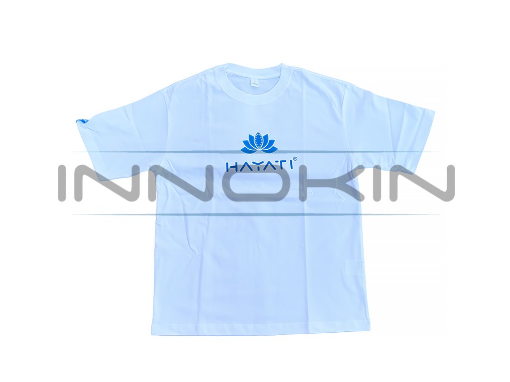 Bílé tričko Hayati s krátkým rukávem, velikost 3 XL. Na přední straně modré logo s lotosovým květem, na zadní straně nápis "Enjoy Hayati® Enjoy...