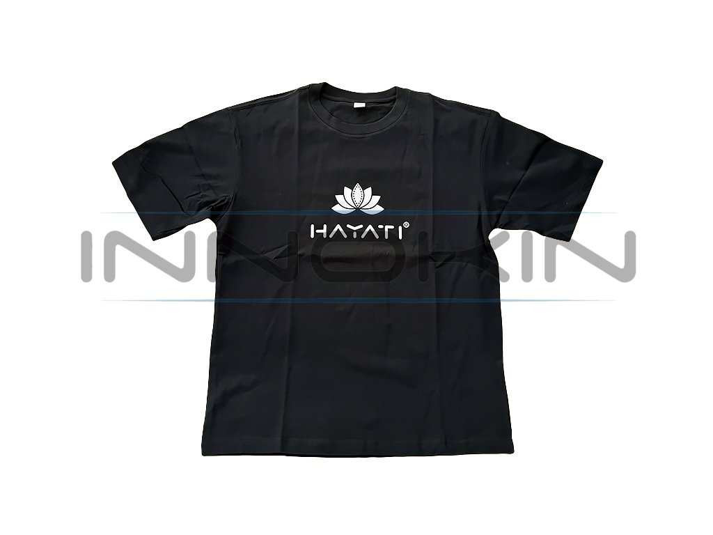 Černé tričko Hayati s krátkým rukávem, velikost XL. Na přední straně bílé logo s lotosovým květem, na zadní straně nápis "Enjoy Hayati® Enjoy...