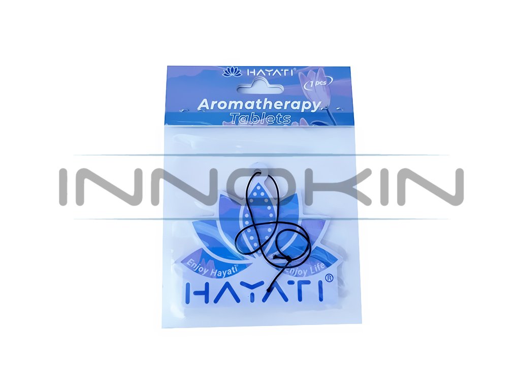 Prémiová závěsná vůně do automobilu Hayati Aromatherapy s charakteristickým designem značky. Produkt je vybaven praktickým poutkem pro snadné zavěšení na zpětné zrcátko nebo jiné místo v interiéru vozu.