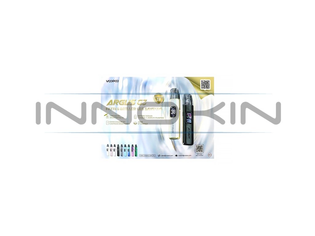 Reklamní plakát ve formátu A5 propagující elektronickou cigaretu VooPoo Argus G3. Plakát zobrazuje dvě barevné varianty zařízení - zlatou a černou - spolu s přehledem dostupných barevných verzí a klíčových vlastností produktu. Kvalitní tisk s atraktivním designem ideální pro prodejny, vapeshopy nebo jako informační materiál pro zákazníky. Plakát obsahuje oficiální grafiku značky VooPoo a zvýrazňuje hlavní přednosti modelu Argus G3.