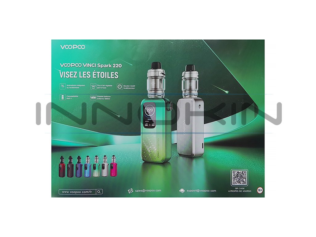 Reklamní plakát ve formátu A5 propagující elektronickou cigaretu VooPoo Vinci Spark 220 s francouzským sloganem "Visez les étoiles" (Mířit ke hvězdám). Plakát zobrazuje dvě barevné varianty zařízení - tyrkysově zelenou a stříbrnou - spolu s přehledem všech dostupných barevných verzí a klíčových vlastností produktu. Kvalitní tisk s atraktivním designem v zelených tónech ideální pro prodejny, vapeshopy nebo jako informační materiál pro zákazníky. Plakát obsahuje oficiální grafiku značky VooPoo včetně QR kódu a kontaktních údajů.