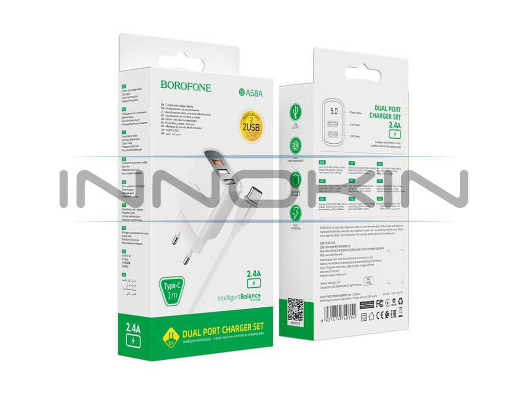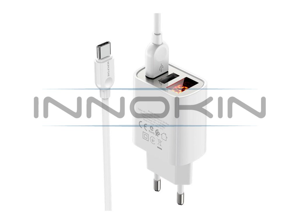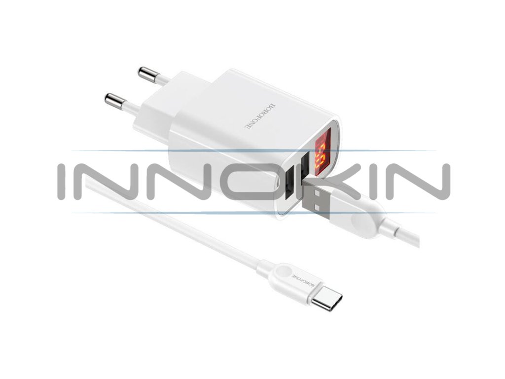 Souprava nabíjecího adaptéru do sítě a kabelu USB-C od výrobce Borofone s označením BA58A umožňuje rychlé a efektivní dobití všech zařízení s konektorem USB-C. Adaptér podporuje nový systém rychlého nabíjení s dobíjecím proudem 2,4 A. Adaptér dokáže efektivně dobít nejenom váš grip a e-cigaretu, ale také například mobilní telefon a jiná zařízení. Disponuje dvěma samostatnými sloty pro připojení kabelu, lze tak pohodlně nabíjet až dvě zařízení současně.