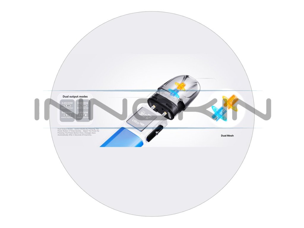 Převratná technologie Dual Mesh umožňuje používání až dvou samostatných mesh pletiv v jádru. Cartridge tohoto modelu je v jádru osazena dvěma samostatnými mesh pletivy, přičemž při nastavení nižšího výkonu je aktivní pouze jedno z nich. Pokud si nastavíte tlačítkem výkon vyšší, automaticky se aktivuje i druhé mesh pletivo a výsledný odpor se vydělí dvěma. Přepnutí do režimu Dual Mesh probíhá zcela automaticky dosažením určité hodnoty výkonu a nastavení celé e-cigarety je nesmírně intuitivní a jednoduché.